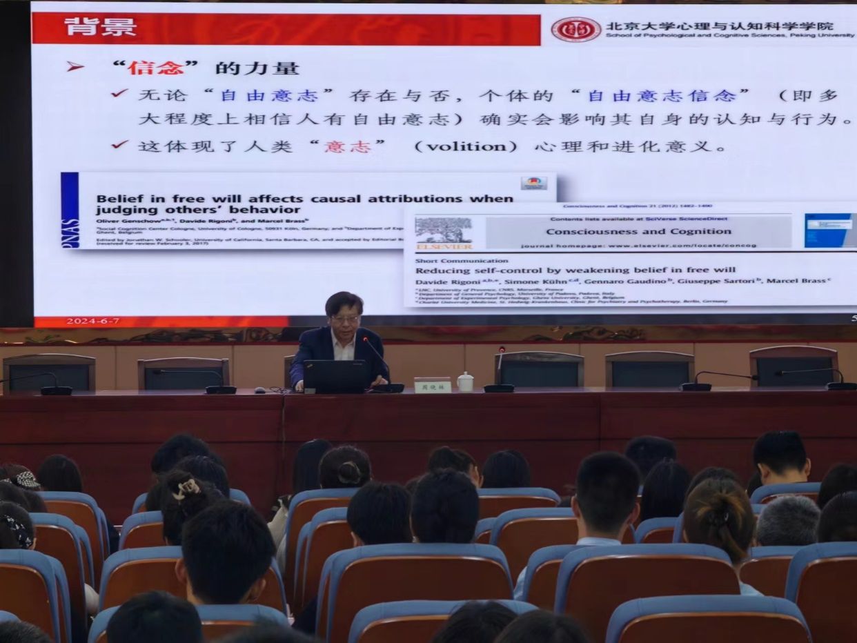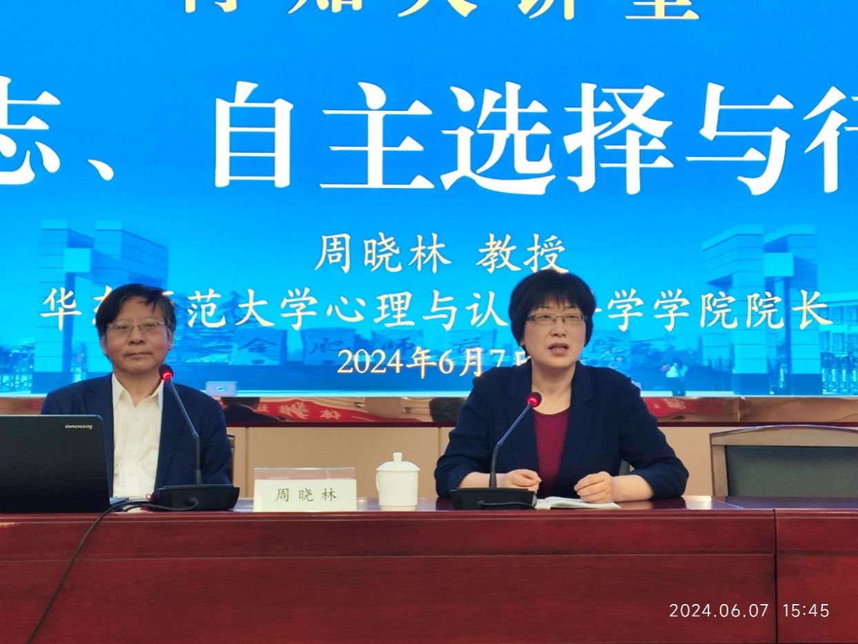 本网讯 6月7日下午,华东师范大学心理与认知科学学院院长、教育部高等学校心理学教学指导委员会主任委员周晓林应邀来院作“自由意志、自主选择与行为控制”学术讲座。讲座前,院党委书记徐成钢亲切会见周晓林教授,院党委副书记、院长方东玲,院学术副院长郝宁出席讲座。科研处、研究生处、相关二级学院等单位负责人及各学院骨干教师、辅导员和学生代表共200余人参加讲座。讲座由方东玲主持。