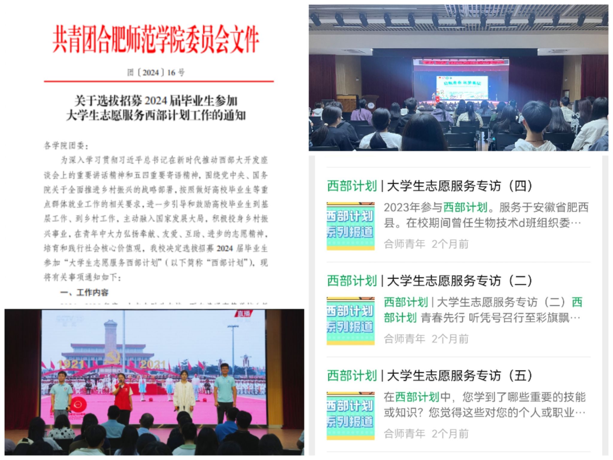 扎根西部、青春接力前行;服务基层,青年挺膺担当。据悉,自2003年国家实施大学生志愿服务西部计划以来,我院先后向新疆、西藏、四川、贵州、甘肃等地区先后累积输送优秀青年学生158名,投身乡村教育、服务乡村建设、基层青年工作、乡村社会治理等专项服务。奔赴西部和基层的合师学子在行动中大力弘扬“奉献、友爱、互助、进步”的志愿精神,积极践行“爱满天下、知行合一”的校训精神,将个人理想融入党和国家事业之中,在西部基层火热的实践中淬炼成长、建功立业,努力成长为有理想、敢担当、能吃苦、肯奋斗的新时代好青年。下一步,院团委将持续做好服务保障和跟踪问效,进一步加强与志愿者的密切联系,着力发掘培育西部计划典型,广泛宣传合师青年学子“扎根西部、服务基层,书写为中国式现代化挺膺担当的青春篇章”的感人事迹和生动实践,为学院高质量发展贡献青春力量。(院团委)