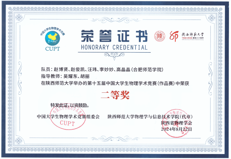 本网讯 8月18日至23日,由中国大学生物理学术竞赛组委会主办,陕西师范大学和陕西省物理学会承办的第十五届中国大学生物理学术竞赛(简称CUPT)在陕西西安举行,本赛事共吸引了来自全国近百所高校的800余名师生参赛。由物理与材料工程学院吴耀东、胡丽老师指导,赵博贤、赵俊凯、汪玮、李妙妙、高晶晶五人组成的参赛团队经过激烈角逐,代表合肥师范学院的参赛作品《吸管水泵的理论与实验分析》终斩获第十五届中国大学生物理学术竞赛(作品赛)二等奖,充分展现了合肥师范学院学子敢于拼搏,积极向上的实力与风貌。