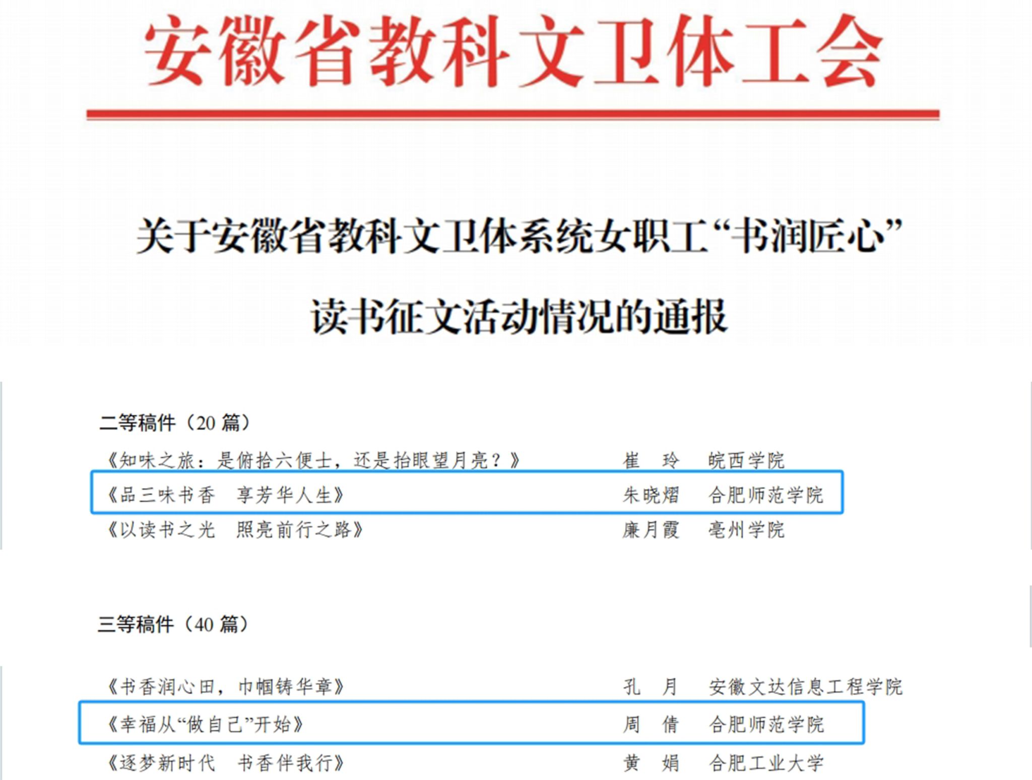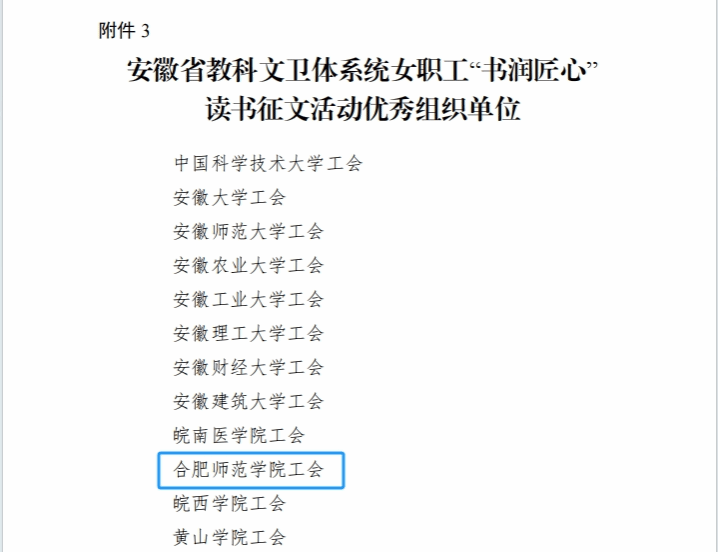 本网讯 近日,2024年安徽省教科文卫体系统女职工“书润匠心”读书征文活动公布结果,我校选送的化学与制药工程学院分工会朱晓熠老师的《品三味书香 享芳华人生》和机关一分工会周倩老师的《幸福从“做自己”开始》从全省高校154篇征文中脱颖而出,喜获二等奖和三等奖,校工会获得安徽省教科文卫体系统女职工“书润匠心”读书征文活动优秀组织单位。