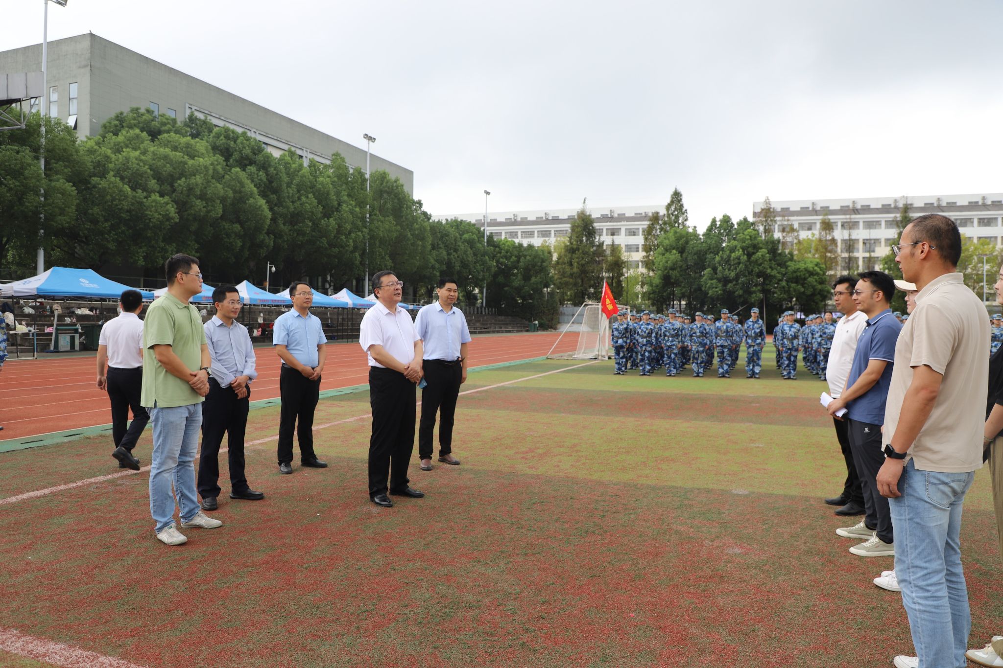 徐成钢一行先后实地查看了锦绣校区监控室、总值班室、图书馆、食堂、门卫岗亭以及军训现场等场所,检查了假期学校安全保卫、值班值守、后勤保障、校园环境卫生、军训施训等情况,并与军训教官和师生员工亲切交谈,向他们致以节日的问候和祝福,对他们的辛勤工作、努力学习、刻苦训练表示肯定,嘱咐大家注意休息、保重身体。