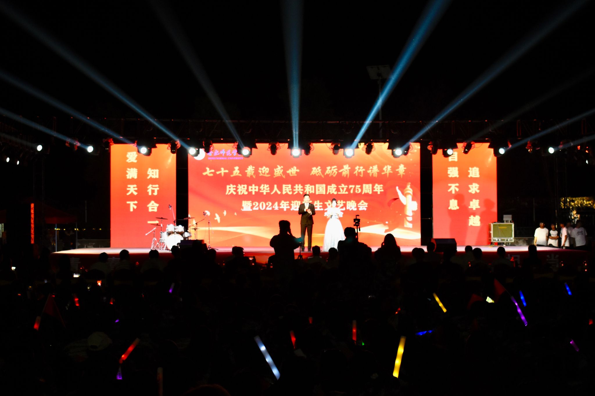 本网讯 9月25日晚,由校团委、学生工作部主办,学生社团文化服务中心承办的主题为“七十五载迎盛世,砥砺前行谱华章”的庆祝中华人民共和国成立75周年暨2024迎新生文艺晚会在滨湖校区田径场举行。滨湖校区综合管理办公室、保卫处、学生工作部、校团委、美术与设计学院等单位负责人及教师,中国联通合肥分公司党委负责同志,军训教官,2024级新生辅导员及2024级新生到场观看晚会。晚会通过“合师青年”官方抖音号直播。