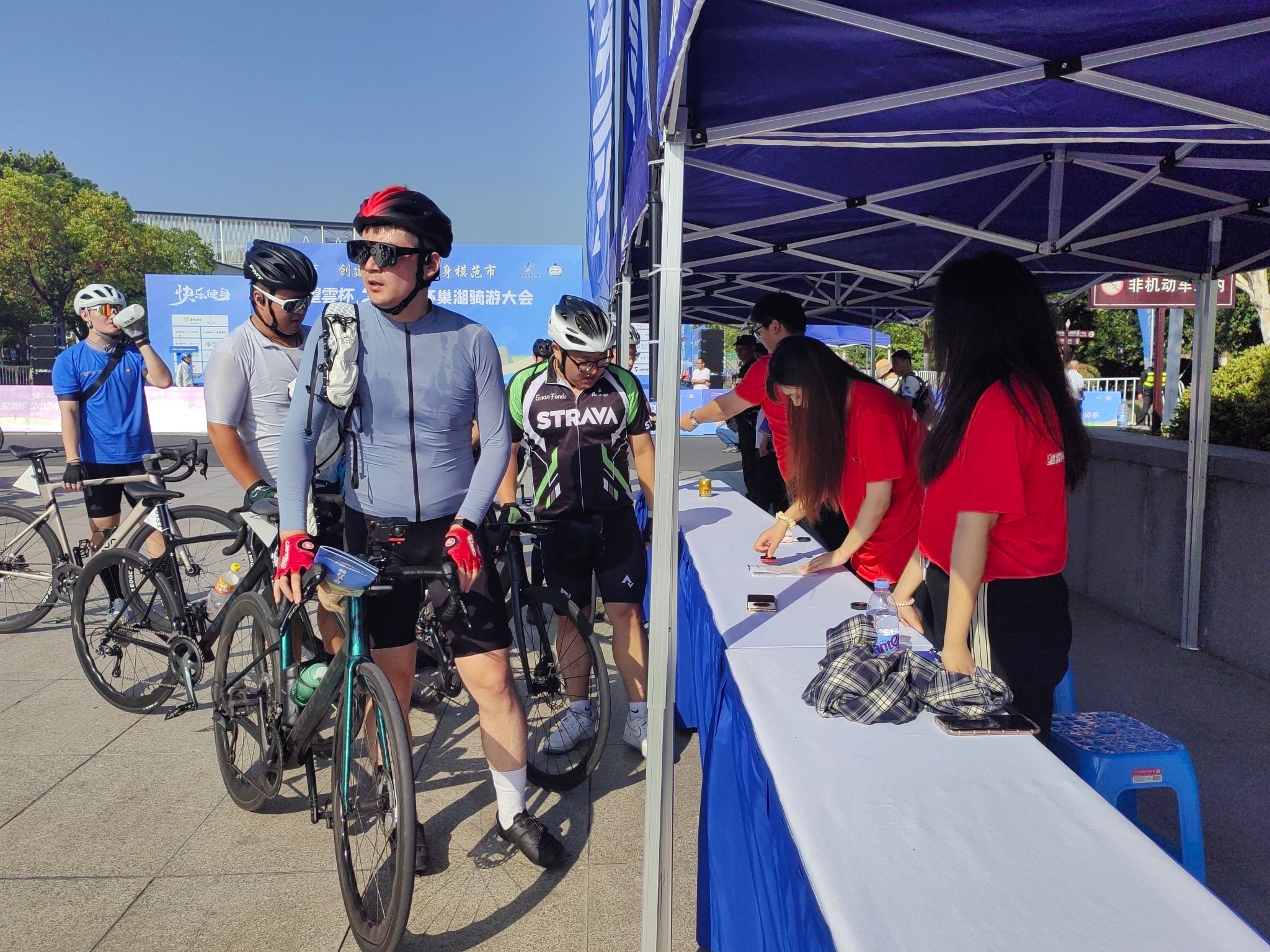 赛前,身着红装的志愿者们在赛场路口指引租车、告知检录,保障选手的顺利入场。在出发区,志愿者们引导选手们分组出发,确保赛事安全启动;在赛道中,志愿者积极为选手发放补给,及时处理突发状况;在终点处,志愿者负责打卡盖章,分发补给物资。国际友人服务组以笑容传递真情,用专业的翻译和热情的服务帮助外国友人更好地了解骑游活动和当地文化。