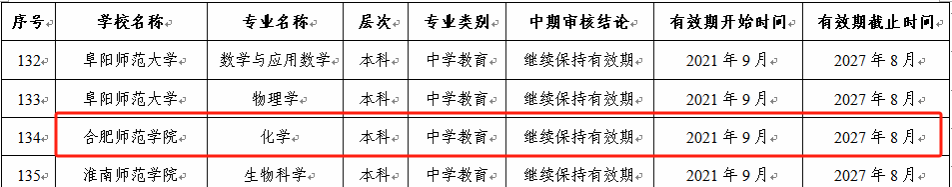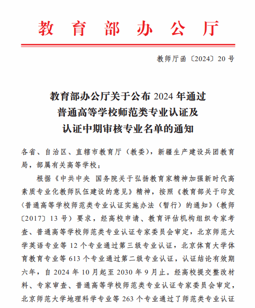 本网讯 近日,教育部办公厅公布了2024年通过普通高等学校师范类专业认证及中期审核的专业名单,我校小学教育、美术学、思想政治教育3个专业顺利通过师范类专业中学教育第二级认证,化学专业通过师范类专业认证中期审核。目前,我校共有9个师范专业通过教育部师范类专业第二级认证。