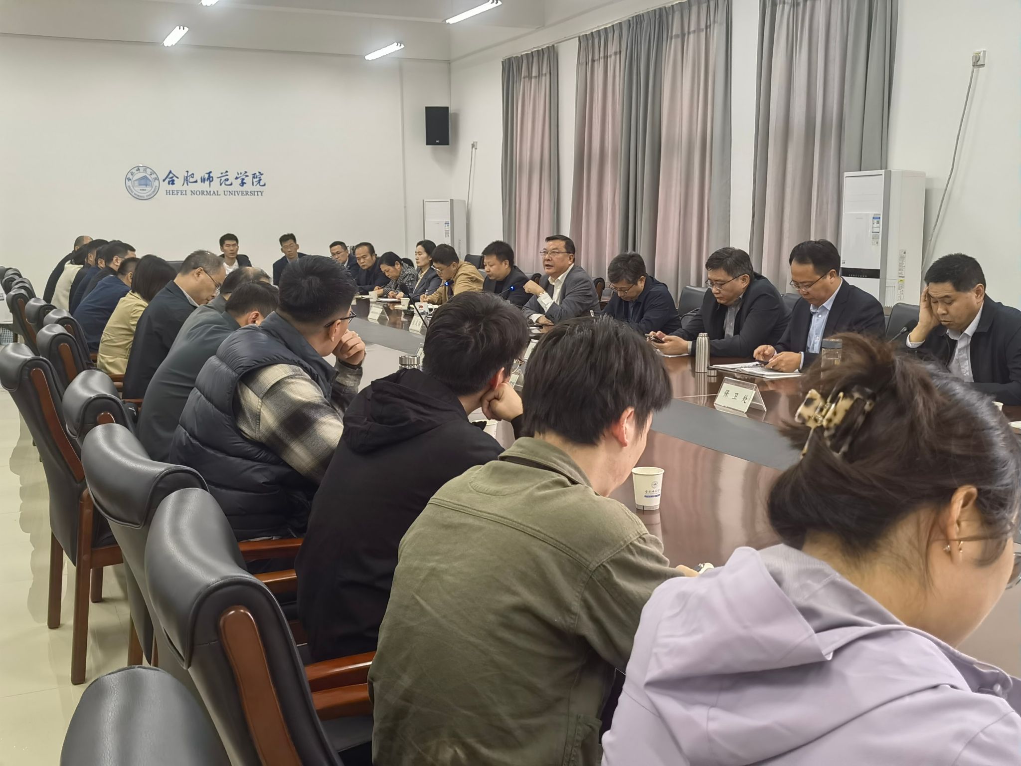本网讯 10月31日,学院在滨湖校区第二会议室召开本学期滨湖校区第二次工作例会。院党委书记徐成钢,党委委员、副院长、滨湖校区管理委员会主任华银峰出席会议。教务处、学生工作处、团委、后勤处(基建办)、保卫处、资产管理处、图书馆、实验室建设与管理中心、信息化管理处、滨湖办等部门负责人、各入驻滨湖校区二级学院带班领导、辅导员老师参加会议。会议由滨湖校区管理委员会办公室主任、滨湖办负责人主持。