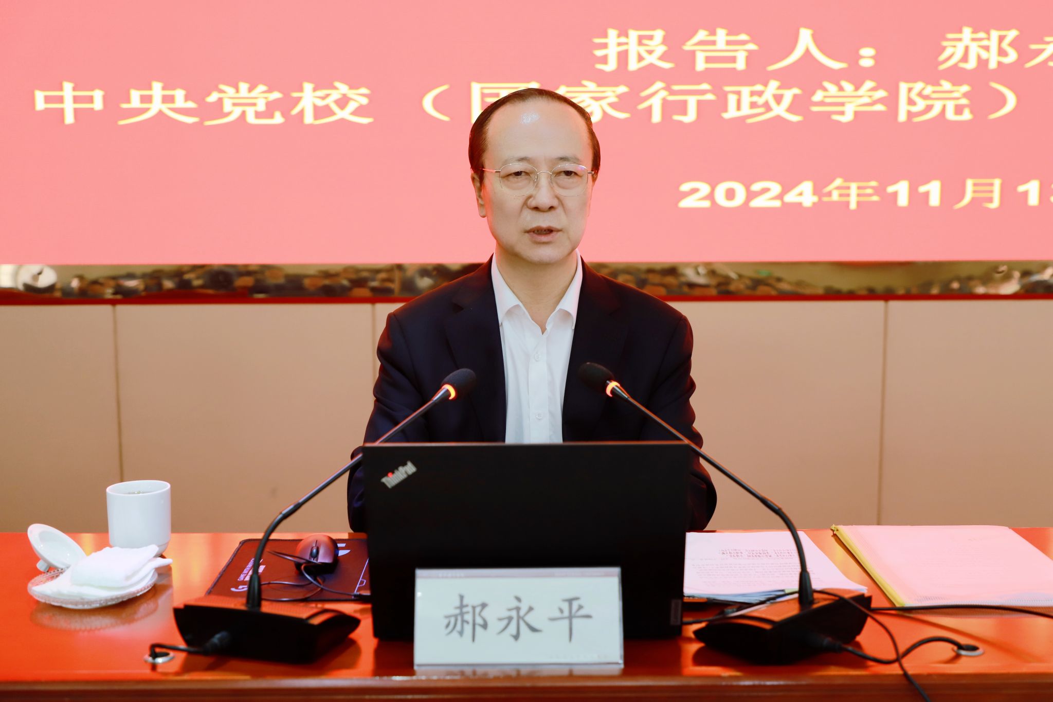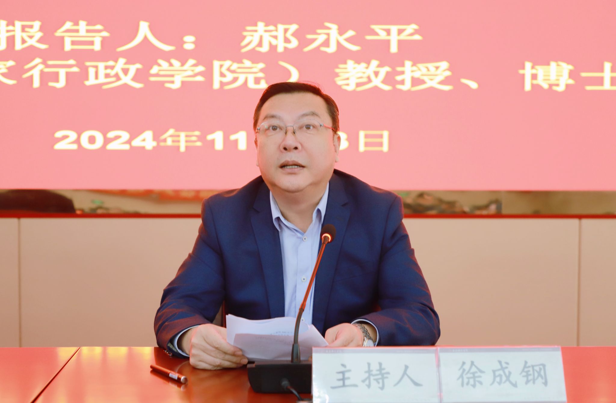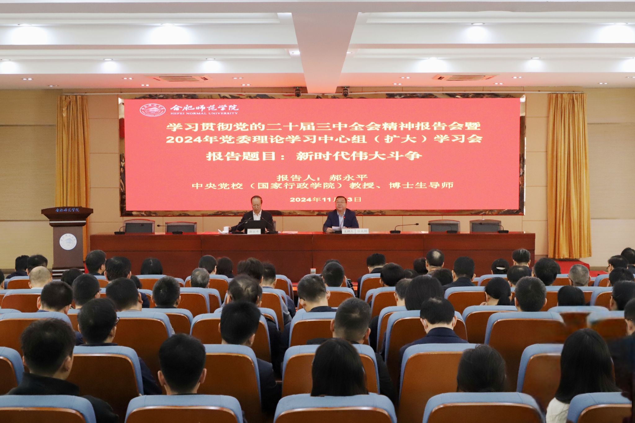 本网讯 11月13日,学院在锦绣校区学术报告厅举办学习贯彻党的二十届三中全会精神专题辅导报告会暨党委理论学习中心组扩大学习会,邀请中共中央党校(国家行政学院)教授、博士生导师郝永平来校作题为《新时代伟大斗争》的辅导报告。报告会由院党委书记徐成钢主持,全体党委理论学习中心组成员、副处级以上干部、思政课教师、专职兼职辅导员,各单位网络信息员和学生代表约280人聆听报告会。