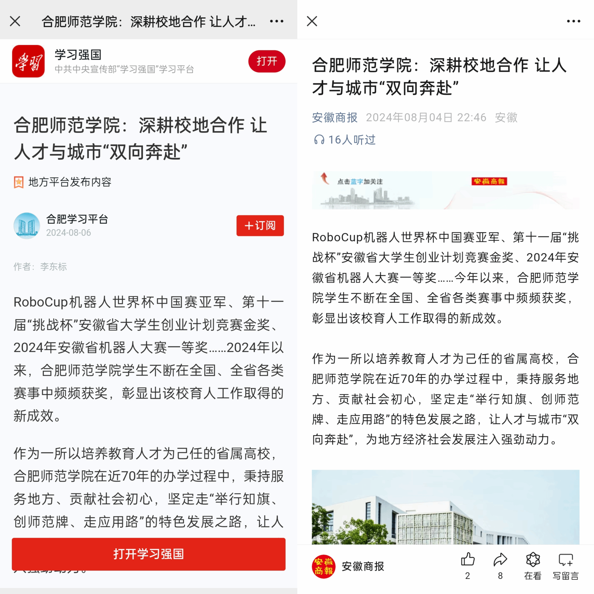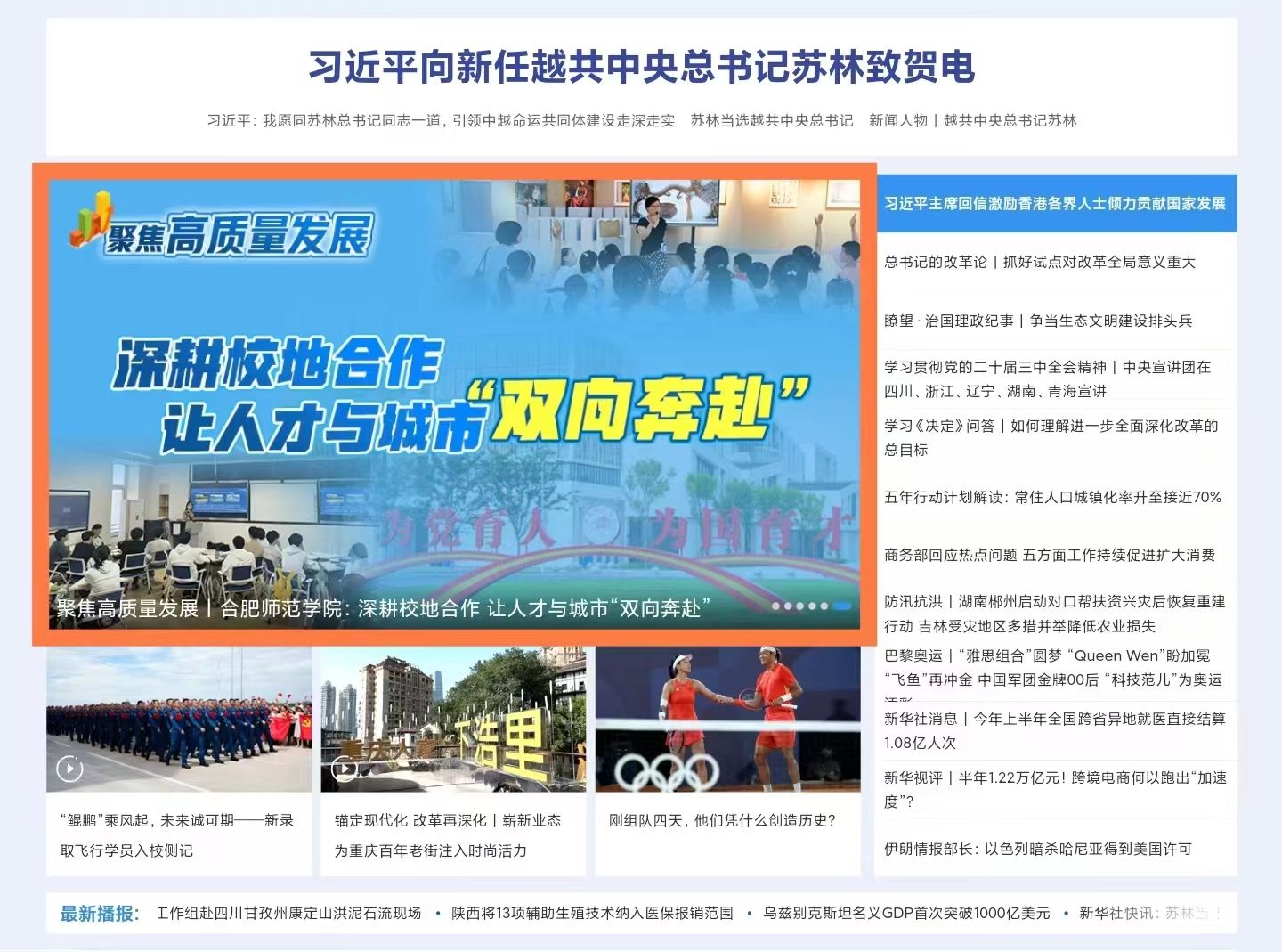 本网讯 近日,新华网首页、新华网客户端以《聚焦高质量发展丨合肥师范学院:深耕校地合作 让人才与城市“双向奔赴”》为题专题报道了我校深耕校地合作,深化基础教育合作,服务地方产业发展的重要举措及成效,总浏览量200万余次。学习强国、安徽商报等进行了转载。(宣传部)