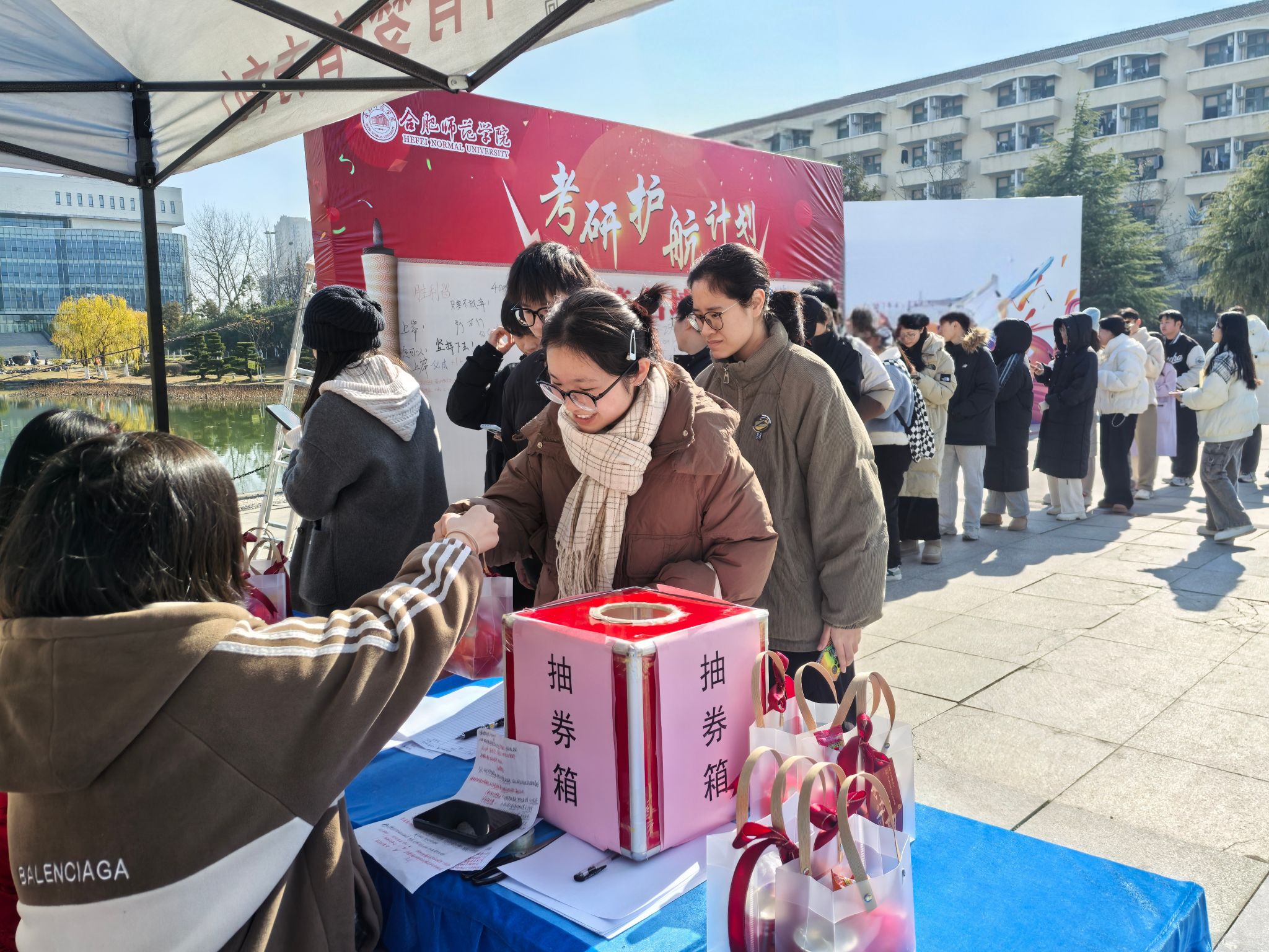 印着“金榜题名”“逢考必过”“未来可期”祝福话语的助研包一份份送到考研学子手中,是学院对学子们的一份关心、一份情谊、一份期盼。以盲盒抽券形式抽取食堂代金券的活动也吸引了许多学子参与,学生表示代金券可以在食堂窗口抵现金使用非常贴心,感受到学院的温暖关怀。学子们还纷纷在签名墙上签名、拍照打卡,写下励志话语激励自己奋战到底、成功上岸。