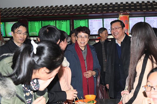 座谈会后,金燕还考察了校园基本建设及整体环境,参观了学校校史馆、学陶馆,实地调研指导学校校园文化建设情况,尤其是学校行知文化建设情况。并走访学生食堂,与学生现场交流,考察食堂饭菜质量价格与花色品种,检查食堂安全卫生,详细询问了解学生对学校食堂的满意情况。