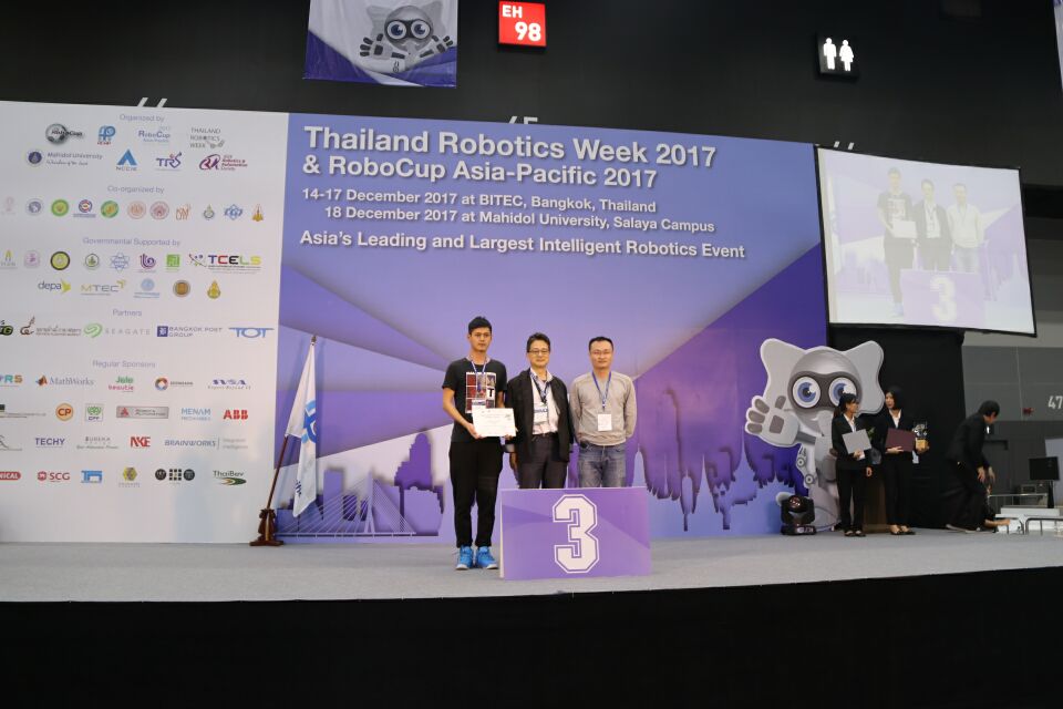 这是我校Robocup实体小型组项目第一次组队参加亚太机器人足球世界杯比赛。在完全接手项目到参加比赛仅两个多月的时间里,全体师生队员从场地配置、机器人调试、代码审核及优化等多方面连续工作,不畏困难,最终能够突出重围,获得参赛资格。全体成员抱着充分交流,虚心求教的态度前往泰国,并最终取得了优秀的成绩。在比赛之余我校队员也积极与其他兄弟参赛队伍进行技术交流和团队的讨论,学习了很多先进的技术和理念,为以后走得更高、更远打下坚实的基础。这场比赛后,师生们纷纷表示收获颇丰,了解到世界强队的技术水平,也认识到机器人技术最新的发展趋势,为后续的研究和发展明确了方向。