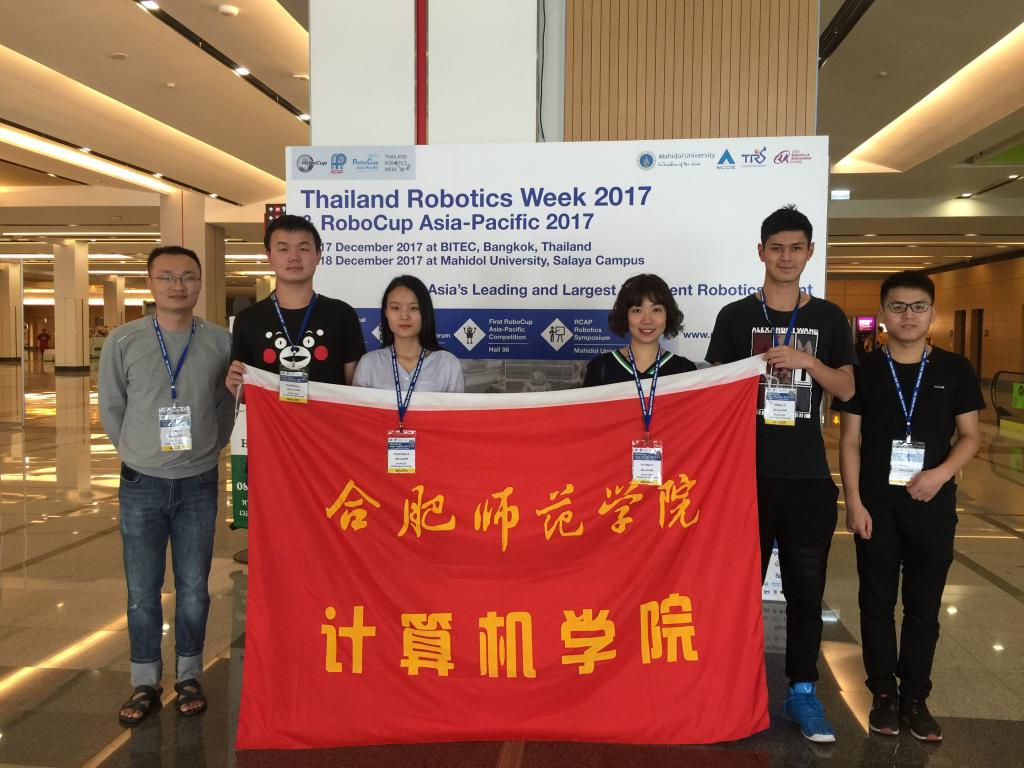 本网讯 近日,亚太机器人足球世界杯比赛在泰国曼谷举行。我校计算机学院何冀军、冯玉婷老师指导,潘鹏、李冉冉、祖婷婷、杨成同学组成的Miracle SM小型机器人足球队代表学校参赛,经过紧张激烈的角逐,最终荣获小型组SSL challenge项目第三名的优异成绩。