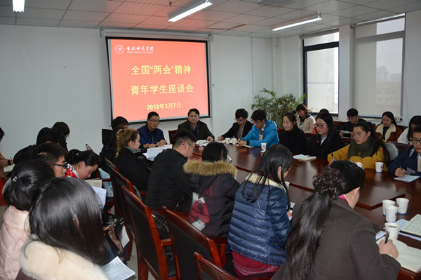 本网讯3月7日,全国两会精神青年学生座谈会在锦绣校区行知楼召开。党委宣传部、校团委相关人员与各学院学生代表参加会议。校团委书记常树宝主持会议。