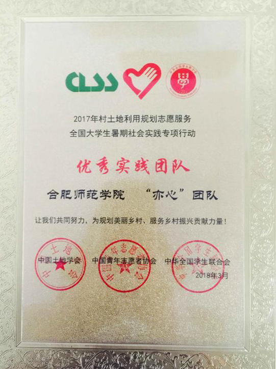 本网讯近日,共青团中央、国土资源部联合组织开展的“2017年村土地利用规划志愿服务全国大学生暑期社会实践专项行动”获奖名单公布,由我校经济与管理学院赵燕老师指导,王雪、李忠杰、高阿峰、王柳柳、张沈伟5名同学组成的“亦心”实践团队获得“优秀实践团队”称号,为全省高校唯一获此荣誉的团队。