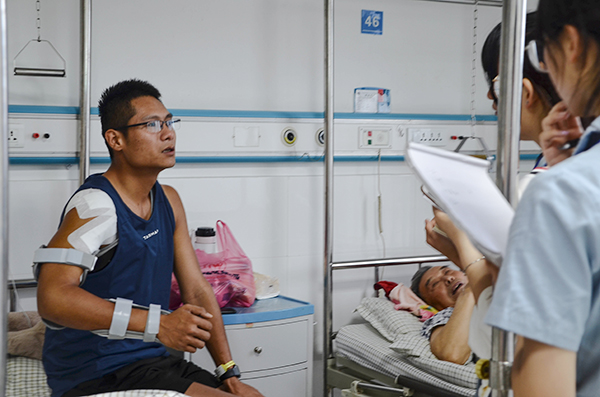 记者向王嘉鹏说明来意,想听他说说当时事情的详细经过。他微笑着摆摆手说:“其实啊,这是一件小事。那天,好像是4月28日,下午七八两节课刚开始,天气很热,我一个怀孕的女同事突然晕倒在了体育场。我恰巧路过,看到情况紧急,也没来得及想什么其他的,就直接抱起她往校医院跑去,当时在路上真的是非常担心,因为根本不知道她为什么会晕倒,又怕这样会不会对胎儿有什么影响。所以一直不敢松懈,以最快的速度到达校医院”说到这儿的时候,王嘉鹏脸上似乎还遗留着当日的紧张。医生检查后说那位女老师没什么大碍,让他们所有人都松了一口气。但这时候王嘉鹏才意识到自己的右胳膊有一股剧烈的疼痛,腿也很不舒服。“可能是当时我跑的太急了,一心只想着以百米赛跑的速度飞奔过去,没考虑到自我保护吧。”他竟有些不好意思地解释道。校医院医生看到他的胳膊变形严重,立即给他做了简单处理,并诊断说这是肱二头肌脱落,要赶紧去医院治疗。