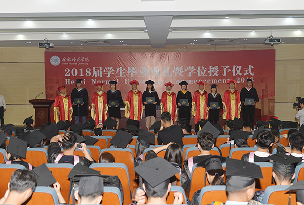 在欢快的乐曲声中,徐成钢、孙道胜为荣获硕士学位、身着硕士服的2018届硕士毕业生授学位,徐成钢、孙道胜、谢阳群、姚本先、汤增产、曹卓良为荣获学士学位、身着学士服的2018届本科毕业生授学位,为他们一一颁发学位证书、拨流苏并合影留念。现场一次又一次响起热烈的掌声。