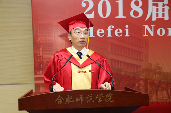学位评定委员会主席、党委副书记、校长孙道胜发表了热情洋溢的讲话,代表学校向2018届全体毕业生表示热烈祝贺,向为同学们的成长付出辛劳、默默奉献的老师和亲人致以诚挚谢意。他充分赞扬了本届毕业生在校期间取得的优异成绩,深情回顾了本届毕业生在校期间学校的发展成就,指出这些成绩的取得,是包括各位同学在内的,全体合师人共同奋斗的结果。学校的发展,有同学们的贡献,而同学们的成长,就是学校最大的发展,学校因同学们而骄傲和自豪。