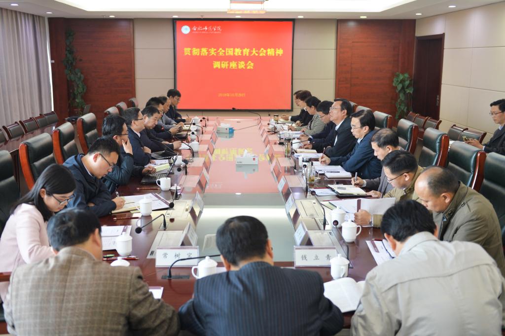 参会人员分别联系学院工作实际,从不同层面就学习贯彻落实全国教育大会精神的进展成效,以及贯彻落实全国教育大会精神和2019年全国教育工作的意见建议等具体工作,与调研组进行了深入交流。