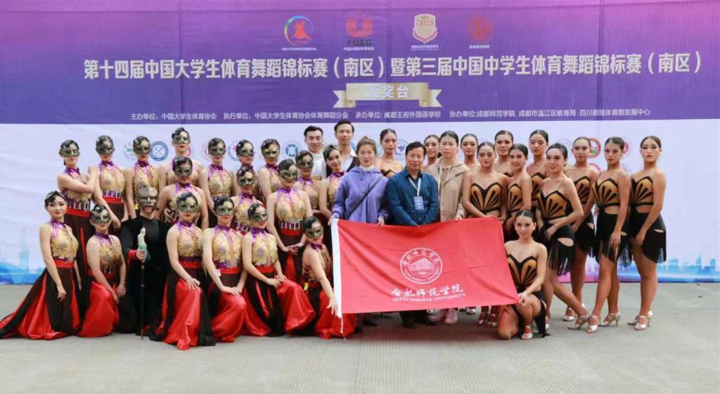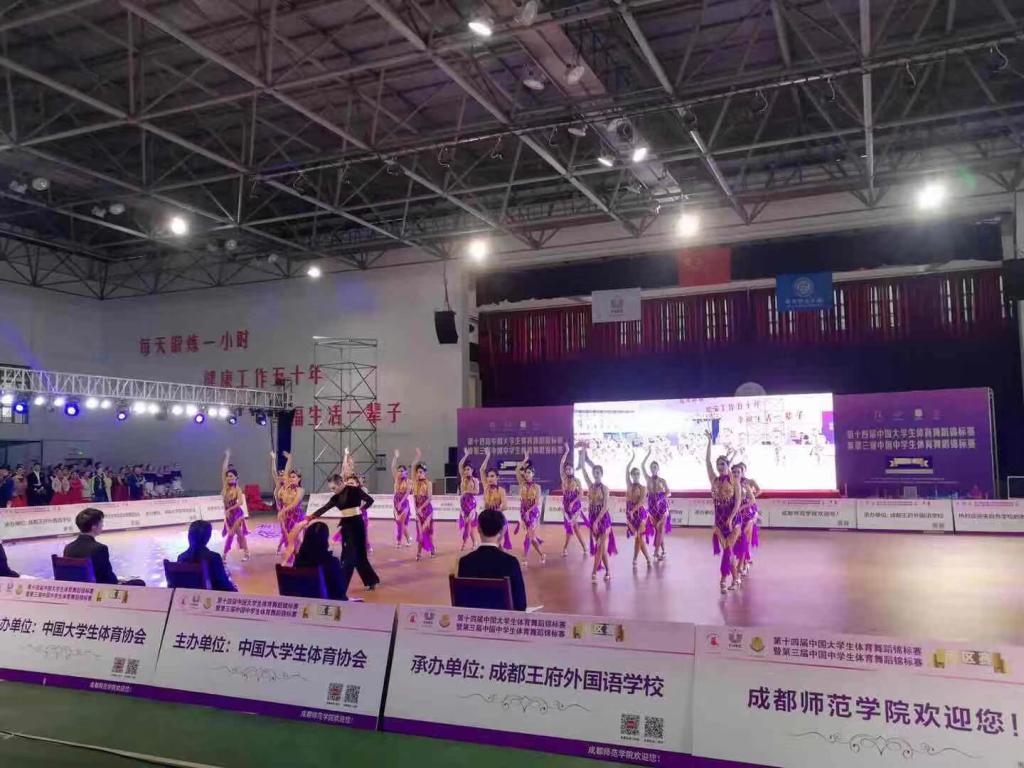 本网讯由中国大学生体育协会主办、成都王府外国语学校承办的2018年第十四届中国大学生体育舞蹈锦标赛于2018年10月27日至28日在成都师范学院体育馆隆重举行。我院体育舞蹈专业的运动员们刻苦训练、努力拼搏、沉着应战,最终获得5金、10银、3铜及“最佳表演奖”的好成绩。