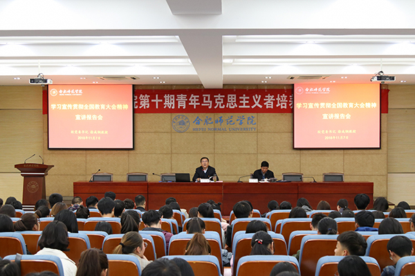 本网讯11月7日下午,学院第十三期团校团学骨干培训班暨第十期青年马克思主义者培养工程首场报告会在锦绣校区学术报告厅举行,院党委书记徐成钢教授为近300名青马工程学员作学习宣传贯彻全国教育大会精神宣讲报告会。院党委副书记吴昕春教授主持报告会,组织部、宣传部、学生工作部、团委等单位负责人和各二级学院团委负责人到场聆听。