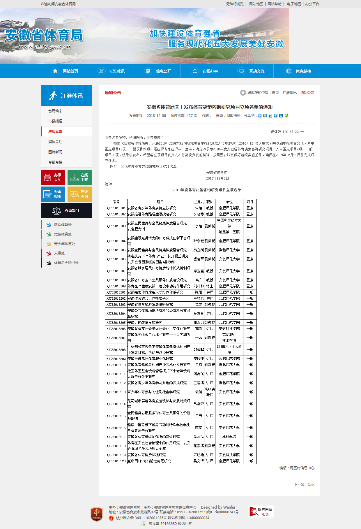 本网讯近日,《安徽省体育局关于开展2018年度决策咨询研究项目申报的通知》(皖体政〔2018〕12号)发布,经专家组评审,我院教师获批12项安徽省体育决策咨询研究项目立项,其中省级重点项目4项,省级一般项目8项。