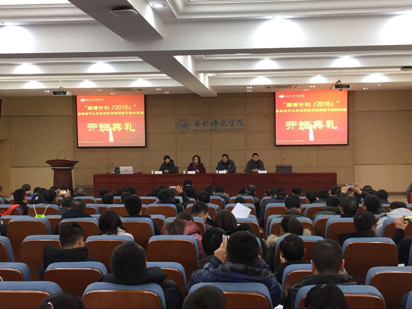 本网讯12月16日上午,“国培计划(2018)”——安徽省中小学足球教师短期集中培训项目在合肥师范学院学术报告厅举行开班仪式。来自全省各地将近150名小学及初中足球教师将在我院接受为期10天的足球专项培训学习。继续教育学院院长吴文、体育科学学院院长宋旭、体育科学学院党总支书记杜文龙出席了开班仪式,仪式由体育科学学院国培办主任李晓静教授主持。