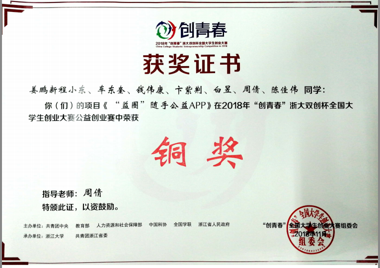 本网讯近日,由团中央、教育部、人力资源社会保障部、中国科协、全国学联、浙江省人民政府共同主办,浙江大学承办的2018年“创青春”全国大学生创业大赛终审决赛落下帷幕。由我院数学与统计学院周倩老师指导,姜鹏新、程小东、车东奎、钱伟康、卞紫荆、白昱、陈佳伟同学的作品《“益圈”随手公益APP》经过省赛、国赛评审,荣获公益创业赛组铜奖。