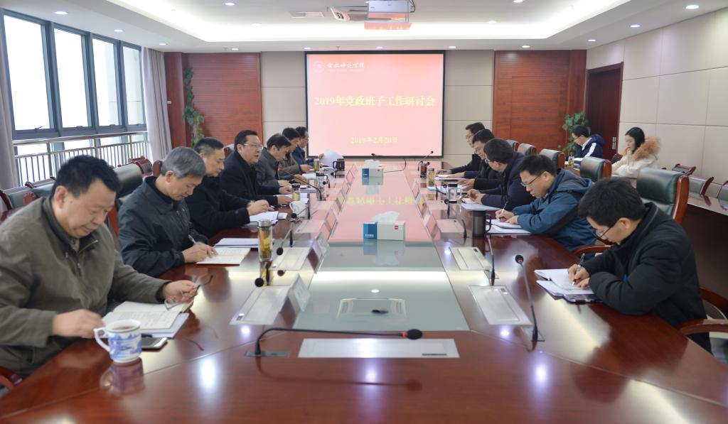 本网讯2月19日至20日,学院组织召开院党政领导班子工作研讨会,深入学习贯彻全国教育大会、全国高校党建工作会议和我省有关重要会议等精神要求,深入分析面临的新形势新任务,研讨交流学院2019年党建和事业发展的总体思路和重点工作。院党委书记徐成钢主持会议,院党政班子成员出席会议,相关部门负责同志列席会议。