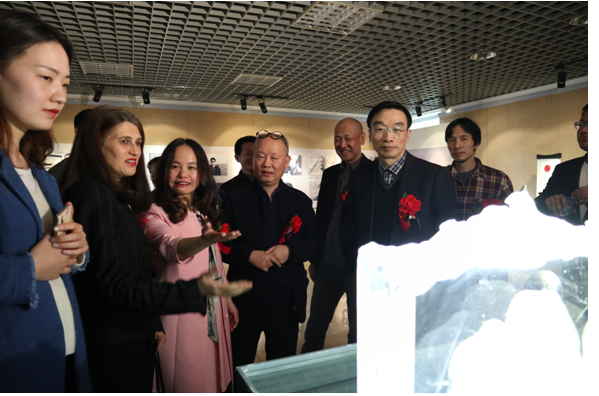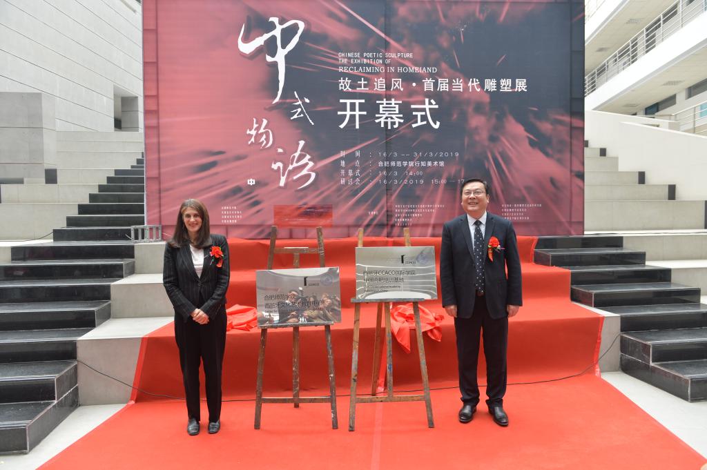本网讯3月16日下午,由合肥师范学院、安徽省美术家协会、合肥市美术家协会、安徽省雕塑院主办,艺术传媒学院、中式物语·徽系雕塑文化高等研究院承办的“中式物语——故土追风·首届当代雕塑展”在学院行知美术馆成功举办。学院党委书记徐成钢教授,党委副书记、院长孙道胜教授,西班牙驻华使馆文化及科学事务参赞Gloria Minguez,马德里康普顿斯大学教授、东亚艺术史研究专家Pilar Cabanas Moreno博士,清华大学美术学院博士生导师许正龙教授,中国文化产业促进会文化遗产保护工作委员会会长、《中国雕塑》执行主编宋伟光,《中国雕塑年鉴》原执行主编、艺术评论家陈培一,西班牙CCACO中西文化交流中心主席于龙玲,安徽省雕塑院院长郭宝安,以及学院党委宣传部、国际交流与合作处、科研处等相关部门负责人出席开幕式并参加了首展。