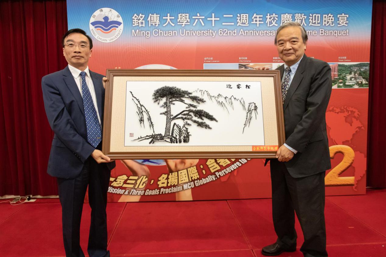 3月22日晚,铭传大学在圆山大饭店举办晚宴,欢迎来自世界各地和海内外的嘉宾及校友。孙道胜代表学院师生对铭传大学建校62周年表示热烈祝贺,并向李铨赠送了富有安徽地方特色的纪念品---黄山迎客松铁画。