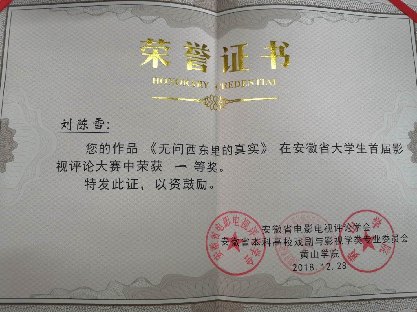 本网讯日前,安徽省首届大学生影视评论大赛揭晓,我院文学院16级汉语言文学专业学生刘陈雪同学喜获大赛一等奖。