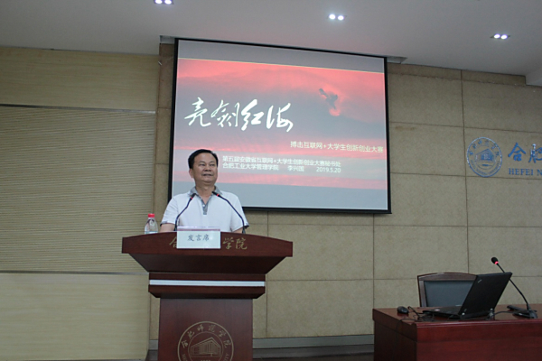 本网讯5月28日,第五届安徽省“互联网+”大学生创新创业大赛组委会专家来校举行专题报告会。大赛组委会执行秘书长、合肥工业大学信息管理与信息系统研究所所长李兴国教授,中国高校创新创业孵化器联盟专家委员会委员、国家互联网数据中心产业技术创新战略联盟专家委员、省赛专家评委宋红彪,第四届全国“互联网+”大赛银奖团队指导老师李书杰和项目负责人宋标应邀出席。教务处负责人、各二级学院负责人、学科竞赛负责人、指导教师、学生代表和及教务处相关工作人员参加了报告会。