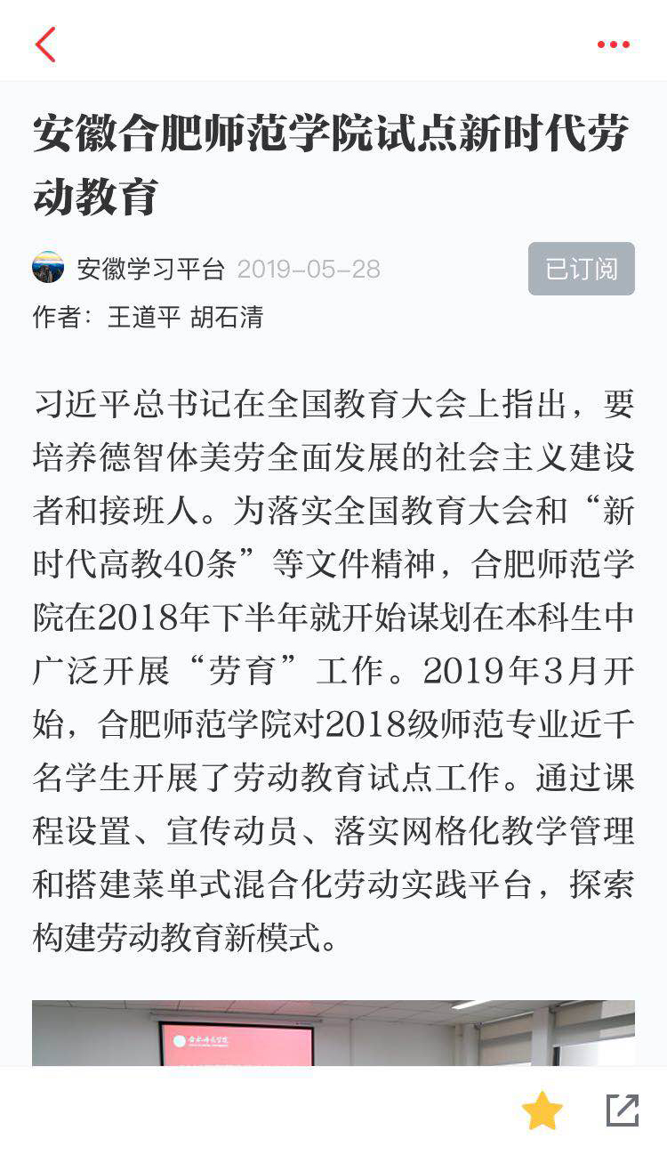 本网讯5月28日,中共中央宣传部“学习强国”平台以《安徽合肥师范学院试点新时代劳动教育》为题,在“创新安徽”栏目转载了我院探索开展师范生劳动教育新闻,再度引发社会各界的广泛点赞和转发。