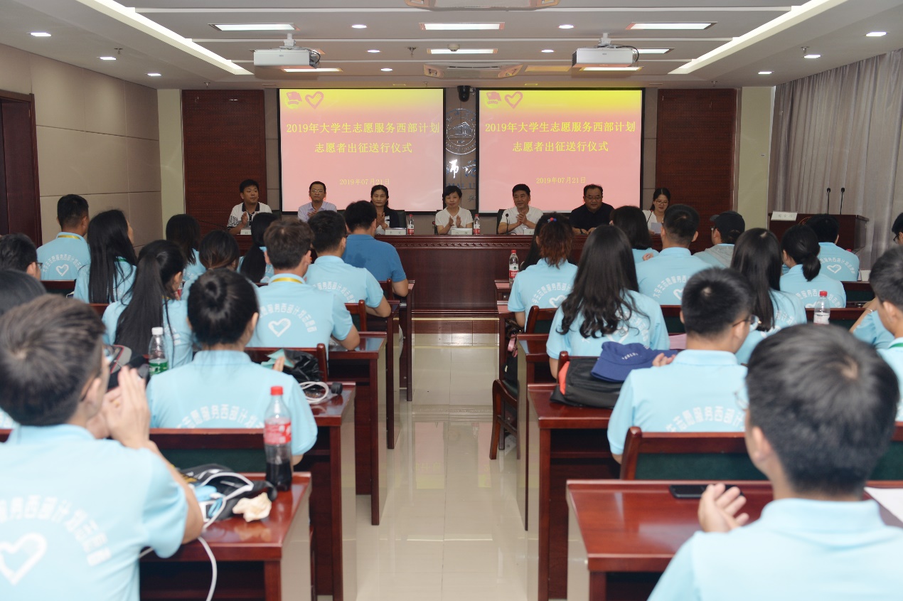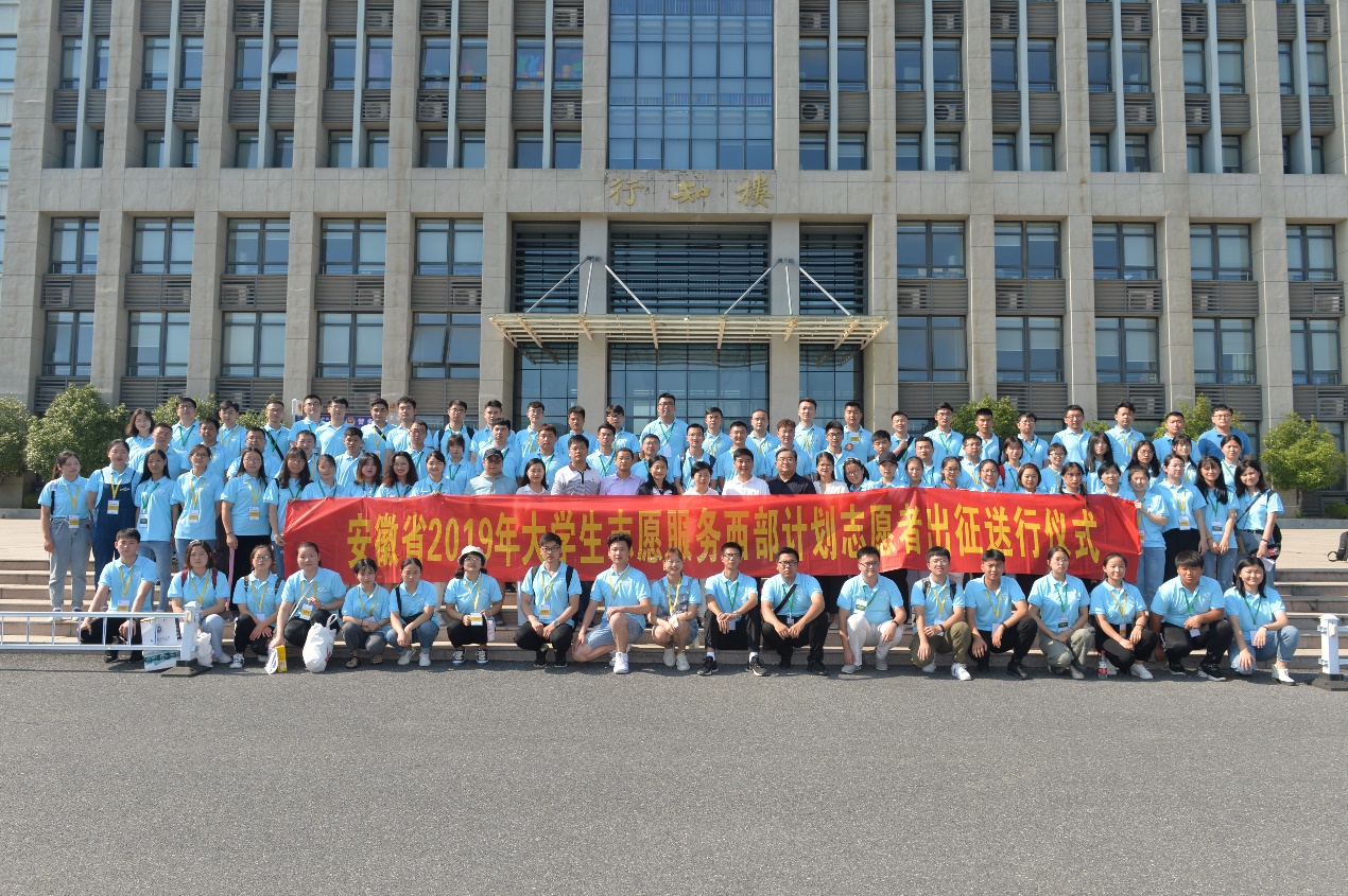 本网讯7月21日,安徽省2019年大学生志愿服务西部计划志愿者出征送行仪式在我院行知楼第三会议室隆重举行。团省委党组成员、副书记张敏,我院党委副书记吴昕春,团省委学校部部长卢蓉、副部长杜盛,省财政厅行政处副处长李霞,省人社厅农民工处调研员杨林,省人社厅人力资源流动管理处副处长占家礼及有关高校团委负责同志,赴新疆维吾尔自治区、新疆生产建设兵团西部计划志愿者等近100余人参加仪式。卢蓉主持仪式。