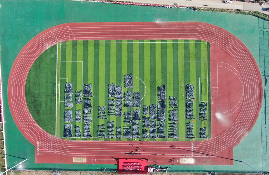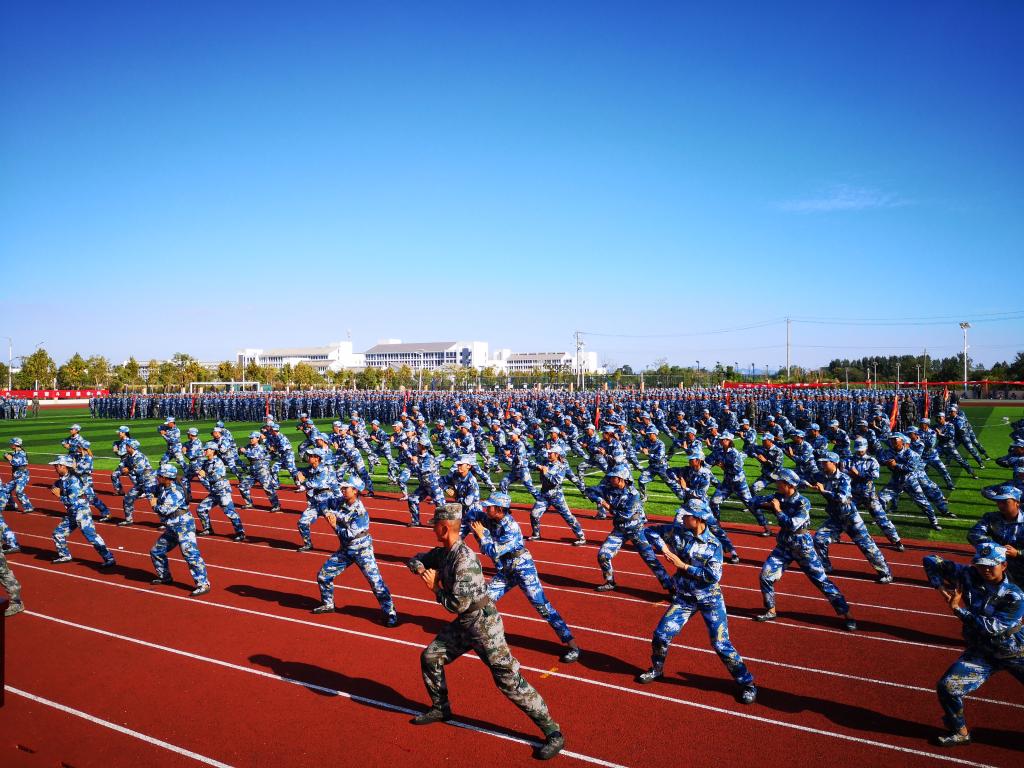 大会在庄严雄壮的国歌声中拉开帷幕。2019级参训新生,身穿统一的军训迷彩服,排着整齐的队列,昂首挺胸站立在运动场上等待领导老师检阅。