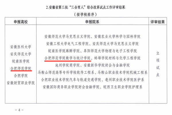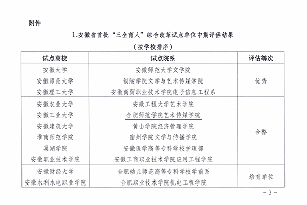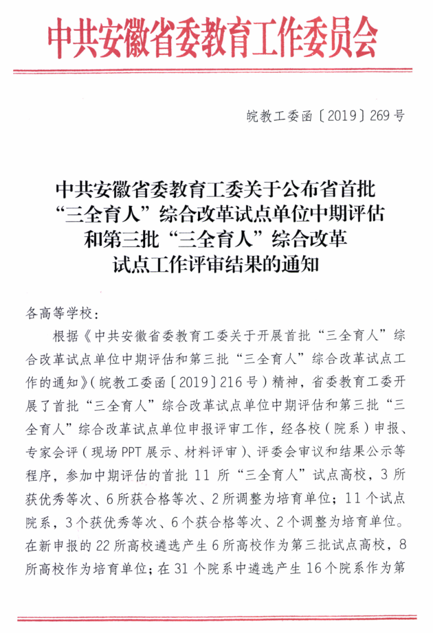 本网讯10月23日,中共安徽省委教育工委公布“三全育人”综合改革试点工作评审结果,我院获批全省“三全育人”综合试点改革高校项目,数学与统计学院、生命科学学院同步获批试点院(系)项目,艺术与传媒学院2018年立项的试点院系项目顺利通过中期评估。至此,我院共有“1+3”三全育人试点项目在研,在省属高校名列前茅。