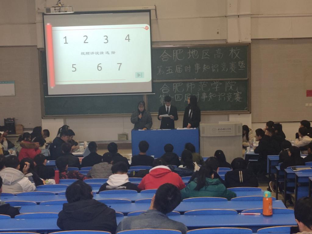 本网讯12月8日上午,由院团委主办,学生社团联合会、社会实践与思想政治理论研究会承办的合肥地区高校第五届时事知识竞赛暨合肥师范学院第十四届时事知识竞赛在锦绣校区逸夫楼举行。院团委相关教师,安徽大学青年学社、安徽农业大学习近平新时代中国特色社会主义思想学生研究会、安徽中医药大学青年马克思主义者学习研究会、合肥师范学院社会实践与思想政治理论研究会、安徽三联学院中国特色社会主义理论研究会、安徽新华学院习近平新时代中国特色社会主义思想学习研究会、安徽职业技术学院马克思主义理论学习研究会七所高校理论类学生社团代表队参加比赛。