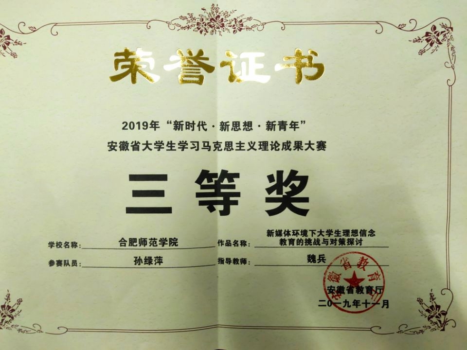 经激烈的总决赛评审,史俊兰同学的《安徽地方名人文化融入高校思想政治教育的路径探析》一文获评2019年“新时代·新思想·新青年”安徽省大学生学习马克思主义理论成果大赛二等奖;孙绿萍的《新媒体环境下大学生理想信念教育的挑战与对策探讨》一文获评2019年“新时代·新思想·新青年”安徽省大学生学习马克思主义理论成果大赛三等奖;学校获大赛“最佳组织奖”。