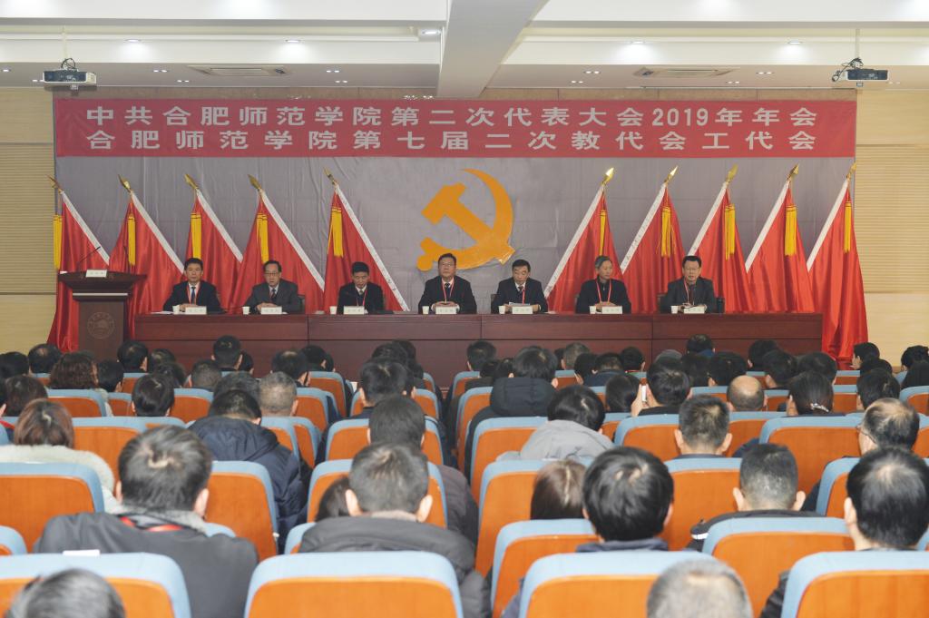 本网讯12月27日上午,中共合肥师范学院第二次代表大会2019年年会和合肥师范学院第七届二次教代会工代会在锦绣校区学术报告厅隆重召开。院党委书记徐成钢,党委副书记、院长孙道胜,党委副书记吴昕春,民建会员、副院长谢阳群,党委委员、副院长姚本先,党委委员、副院长曹卓良,党委委员、纪委书记徐文林及全体党代会代表、教代会工代会代表出席大会,非代表的处级党员领导干部、省以上“两代表一委员”、民主党员党派基层组织负责人、分工会主席、专职辅导员列席大会开幕式。孙道胜主持开幕式。