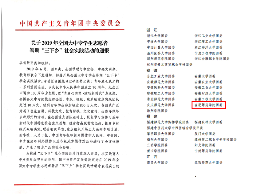 又讯,近日,省委宣传部、省文明办、教育厅、团省委、省学联联合公布了2019年安徽省大中专学生志愿者暑期“三下乡”社会实践活动评选结果,我院获得多项表彰。文学院“热血青春营”赴合肥社区理论普及宣讲团、合师青年“贝壳侠”赴皖南地区历史成就观察团、体育科学学院“爱体之行”赴蒙城县教育关爱服务团3支团队获评2019年全省大中专学生志愿者暑期‘三下乡’社会实践活动优秀实践团队;教师教育学院分团委书记王磊、数学与统计学院分团委书记周倩2名教师获评2019年全省大中专学生志愿者暑期‘三下乡’社会实践活动优秀个人;4篇调研报告获评2019年全省大中专学生志愿者暑期“三下乡”社会实践活动优秀调研报告。(院团委)