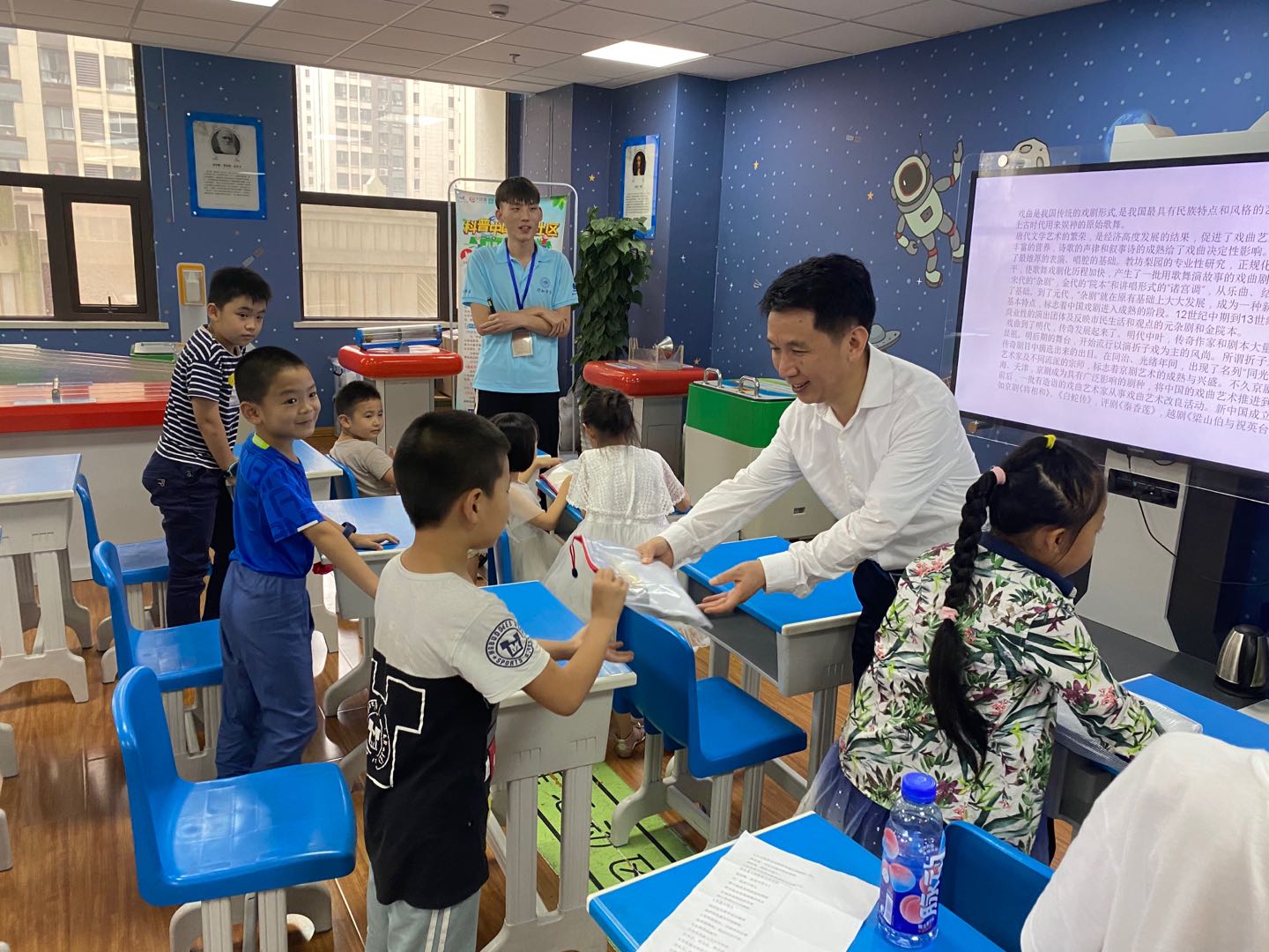 徐文林一行到达学堂时,小学员们正在上一堂中国戏剧文化知识课。小先生田洪生通过视频动画相关结合,把抽象的事务形象化,小朋友们听的津津有味。当看到小朋友对中国传统戏曲文化了有更深一步的了解后,徐文林对此给予充分肯定和勉励。