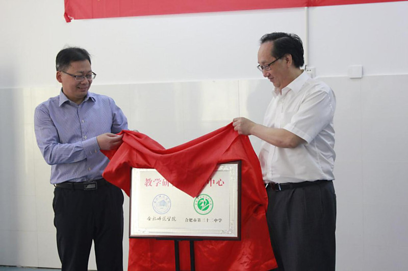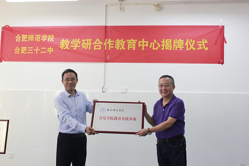 最后,姚本先和徐生彬共同为合肥师范学院、合肥市第三十二中学教学研合作教育中心揭牌。音乐学院院长罗可曼与王强共同为合肥师范学院音乐学院教育实践基地揭牌。