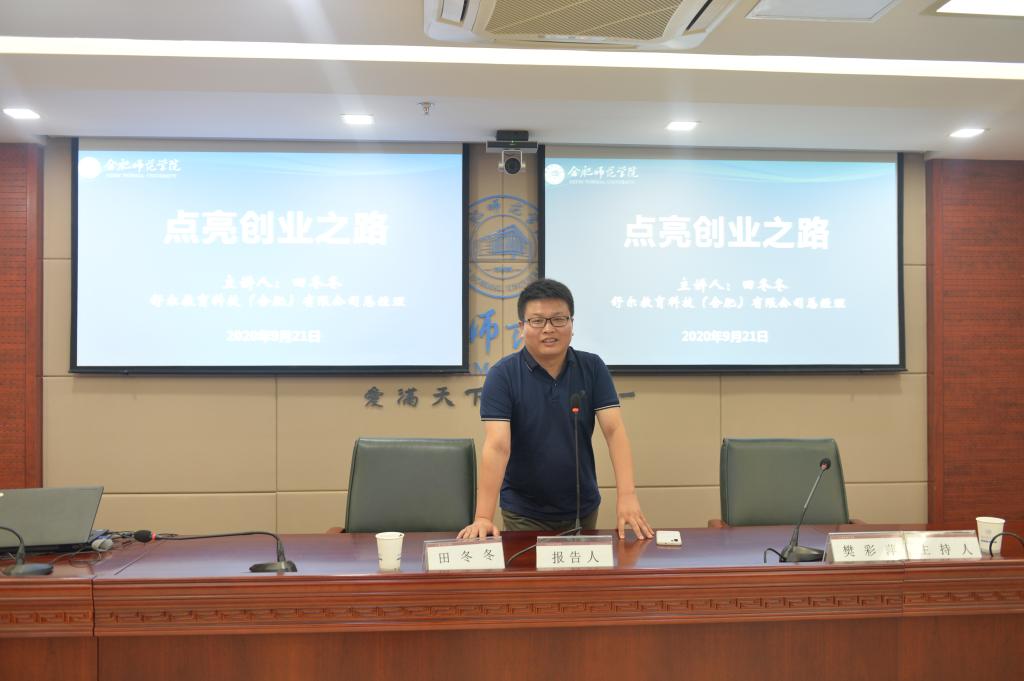 本网讯9月21日下午,我院2013届化学专业校友、舒尔教育科技(合肥)有限公司总经理田冬冬应邀回到母校,在行知楼2011会议室作了题为“点亮创业之路”的讲座。化学与化学工程学院、外国语学院、文学院、艺术与传媒学院的本科生代表和部分教育硕士聆听了讲座。讲座由发展规划处(校友办)副处长樊彩萍主持。