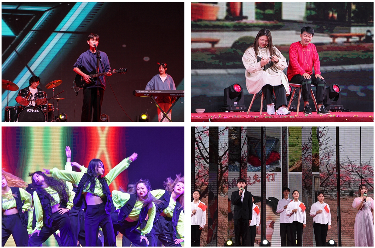 弦舞吉他社带来的歌曲串烧以高昂的旋律拉开晚会序幕。朗诵《合师颂》诵读出合师六十五载辉煌岁月。歌曲《不忘初心》婉转动听,以优美的旋律表达了合师学子青春心向党的人生追求。话剧《军训》生动展示了新生在军训时的别样体验。舞蹈《重生》在光影的渲染下,给观众带来了一场视听盛宴,并将晚会推向高潮。歌曲《合师校园》展现了合师学子朝气蓬勃、青春洋溢的精神风貌,优美的原创歌曲令人身心荡漾,沉醉其中。舞蹈《集英之旅》将舞蹈、舞台剧元素与动漫相结合,收获阵阵掌声。小品《我的大学生活》将大学宿舍里的同学关系展现得惟妙惟肖,赢得了场下观众的阵阵掌声。走秀《缪斯之路》展现了同学们朝气蓬勃、青春洋溢的健康形象。歌曲《共和国之恋》歌声铿锵有力,充满力量,唱出了合师学子对祖国母亲的情深意切。舞蹈《疫.忆》用艺术形式再现了疫情期间那些动人的场景,生动展现了中国人民众志成城、抗击疫情的信念。歌曲《风吹麦浪》歌声悠扬,以柔和的旋律生动展现出如今祥和繁荣的中国。整场晚会精彩不断,高潮迭起,赢得台下阵阵掌声。滨湖校区辅导员老师的合唱《复兴的力量》《合肥师范学院校歌》真情流露,饱含了对合师学子们的殷切期望和对祖国、对合师的热爱,为本场晚会划上了圆满的句号。