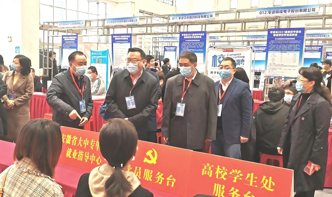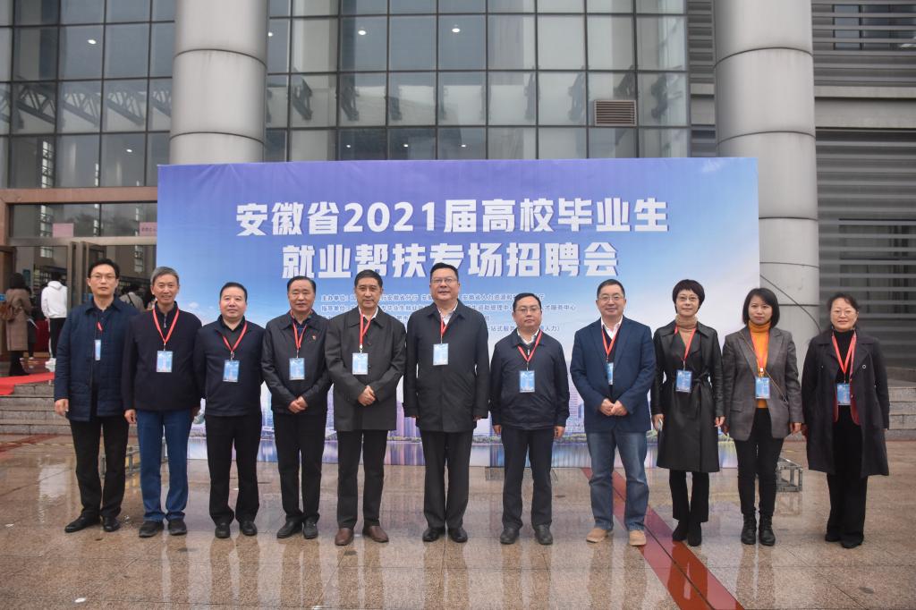 本网讯为深入贯彻落实党中央、国务院及省委、省政府“六稳”“六保”决策部署和就业优先政策,进一步发挥高校在巩固就业扶贫工作成果中的作用,持续做好2021届高校毕业生就业帮扶工作,11月21日上午,由国家开发银行安徽省分行、省教育厅、省人力资源和社会保障厅主办,省大中专毕业生就业指导中心、省学生资助管理中心、省人才服务中心指导的安徽省2021届高校毕业生就业帮扶专场招聘会在我院锦绣校区体育馆成功举行。省教育厅高校学生处处长陈锋,学生资助管理中心主任李炳银,大中专毕业生就业指导中心主任袁江林、副主任王素苗,省人社厅就业促进和失业保险处处长吕泉,省人才服务中心副主任余松柏,国开行客户四处处长杨毅,正德人力集团董事长管政和我院党委书记徐成钢,副院长谢阳群,以及相关部门负责人、各二级学院党政负责同志等到会指导并巡视了招聘会现场。