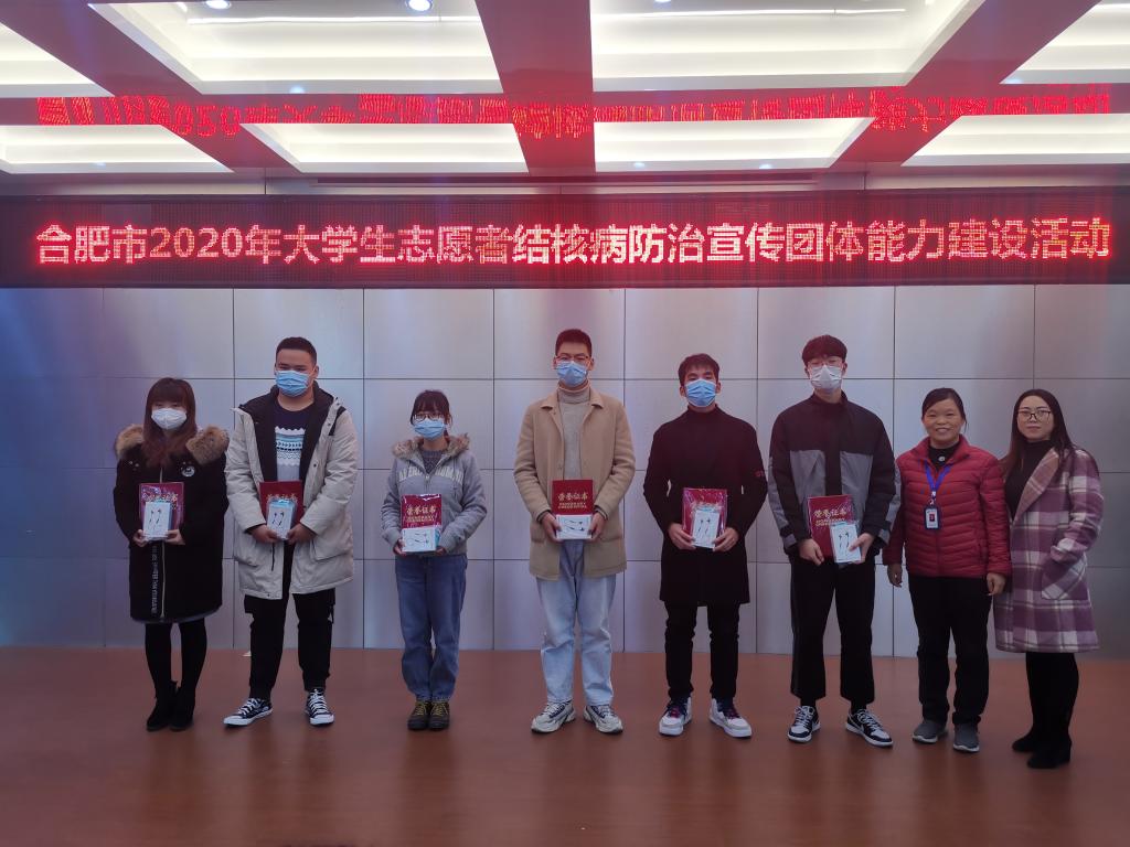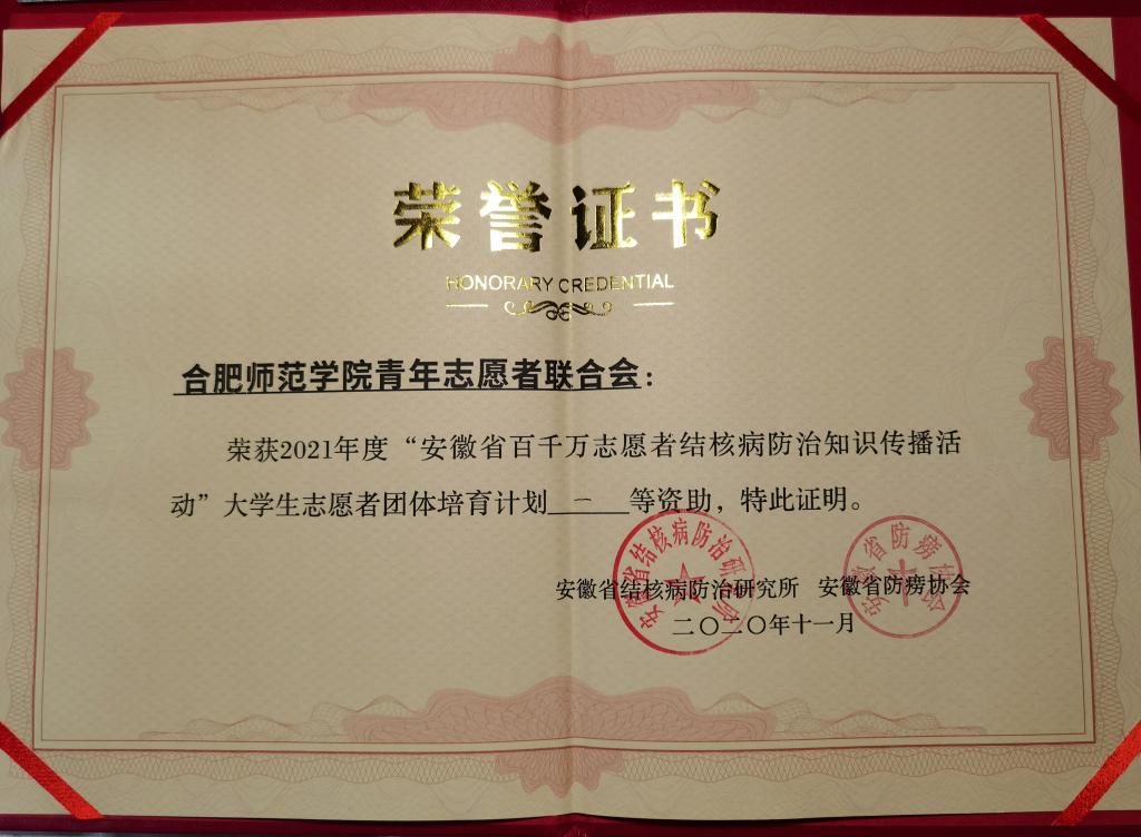 本网讯12月13日,“安徽省百千万志愿者结核病防治知识传播活动”暨“2021年度大学生团体培育计划”颁奖仪式在合肥市疾控中心举行,我校青年志愿者联合会荣获“2021年度‘安徽省百千万志愿者结核病防治知识传播活动’一等志愿者团体”和“2021年度大学生志愿者团体培育计划一等资助”表彰。