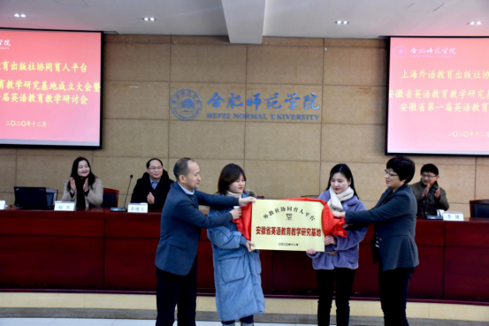 本网讯12月19日上午,合肥师范学院外国语学院和上海外语教育出版社联合举办“外教社协同育人平台 安徽省英语教育教学研究基地”成立大会和揭牌仪式,会议在合肥师范学院锦绣校区学术报告厅隆重举行。来自省内外高校及全省各地市区英语教育专家和学者共80多人参加了大会。