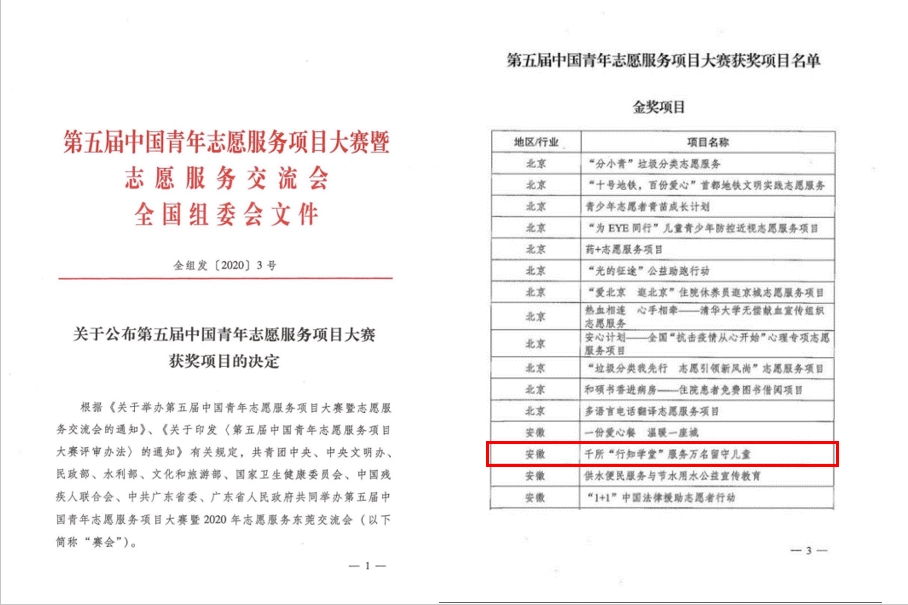 本网讯日前,第五届中国青年志愿服务项目大赛全国总决赛落下帷幕。我校《千所“行知学堂”服务万名留守儿童》项目荣获全国金奖(安徽省仅4项,全省高校仅1项),实现了学校各类“国字号”赛事金奖零的突破。