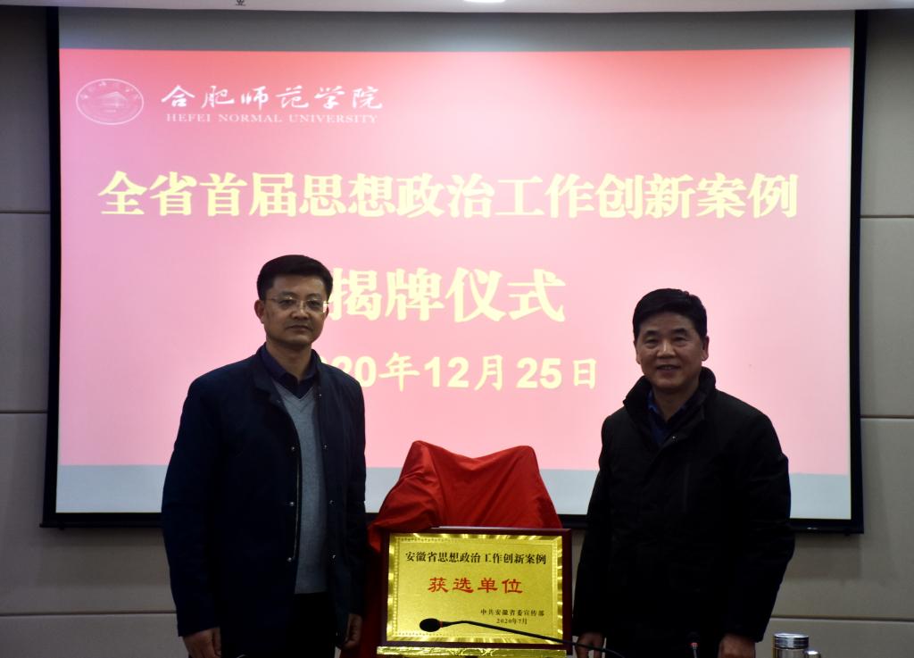 省委宣传部思想政治工作处二级主任科员阮玉华宣读了表彰文件,夏捍东与吴昕春一起共同为合肥师范学院获评“全省首届思想政治工作创新案例”揭牌。