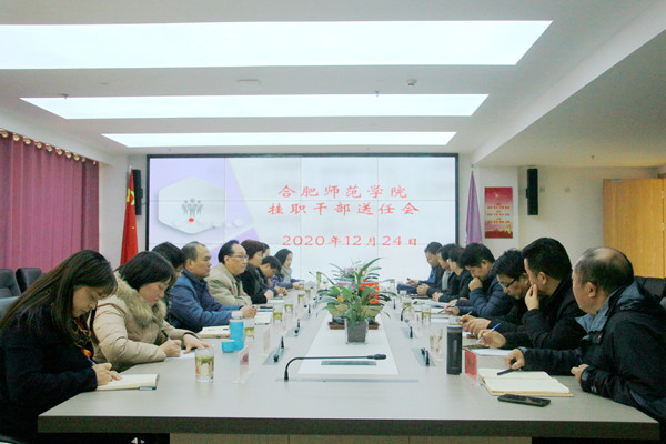 本网讯12月24日下午,我院挂职合肥经开区教师送任会在合肥经开实验学校会议室举行,党委委员、副院长姚本先,教务处、组织部、人事处等单位负责人,挂职教师;合经区社会发展局党委副书记、纪委书记时宗田,党委委员、副局长杨会谦,党委委员、综合管理处处长刘艳松以及挂职学校领导参加会议。会议由杨会谦主持。