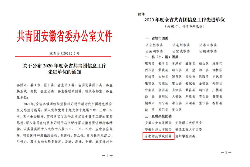 本网讯近日,共青团安徽省委印发《关于公布2020年度全省共青团信息工作先进单位的通知》,我校榜上有名,全省共61个单位(仅6所直属高校团委)获此荣誉。